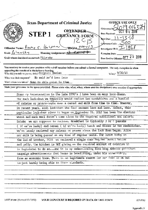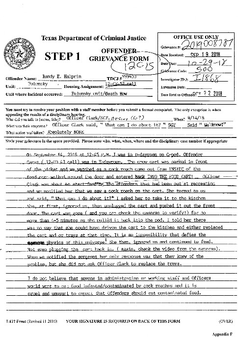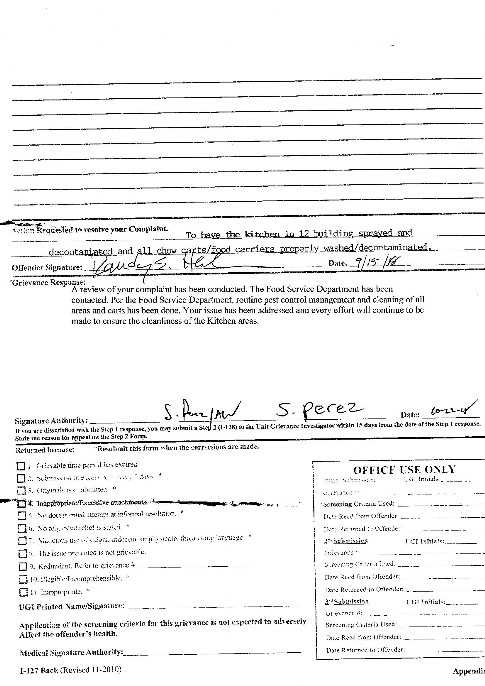 [Below, you will see a copy of the grievance I filed on the cockroaches in the food carts...I guess I won??]