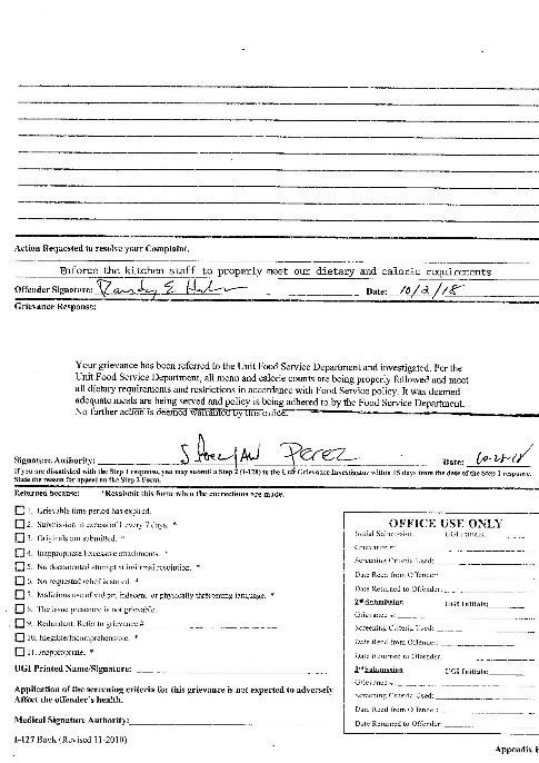 So, last night I also received a response to the latest grievance that I will have posted below this journal...the grievance was about the sack meals they were feeding us during the last lock down, and how they did not meet the dietary standards. To give an example, breakfast is supposed to be 600 total calories, lunch 800 calories, and I believe dinner is another 600. However, for breakfast, all that they were giving us was 3 or 4 pancakes thrown into a bag...We used to get raisins or some kind of fruit, and a PB&J sandwich. Lunch used to be a fruit item, PB&J, and another sandwich. What they've been giving us lately...the calories are barely adding up to 1100-1200, and that is being liberal with the math! Well, I lost the grievance as the kitchen said we were getting what we're suppsed to get. Sucks, but that's our life back here now.