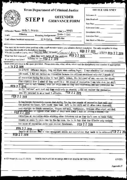[Below you'll see a scanned copy of the grievances I filed...Apologies for the poor quality - these forms are very difficult to scan effectively.]